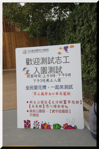 胖胖上星期參加完臺北花博試營運--新生公園區之後.這星期又參加了圓山公園區的花博試營運.一大早集合之後.大家就開始排隊進入園區.因為這次是不採用門票的方式進場.所以現場有點混亂.但大致的秩序是良好的.在現場胖胖還是發現同樣的一個問題.完全沒有英文或日文導覽手冊.問了所有館區的相關志工同樣的問題.給我的答案是開始營運時應該會有外文導覽手冊或外文語音導覽機.這樣的答案讓胖胖充滿著懷疑.